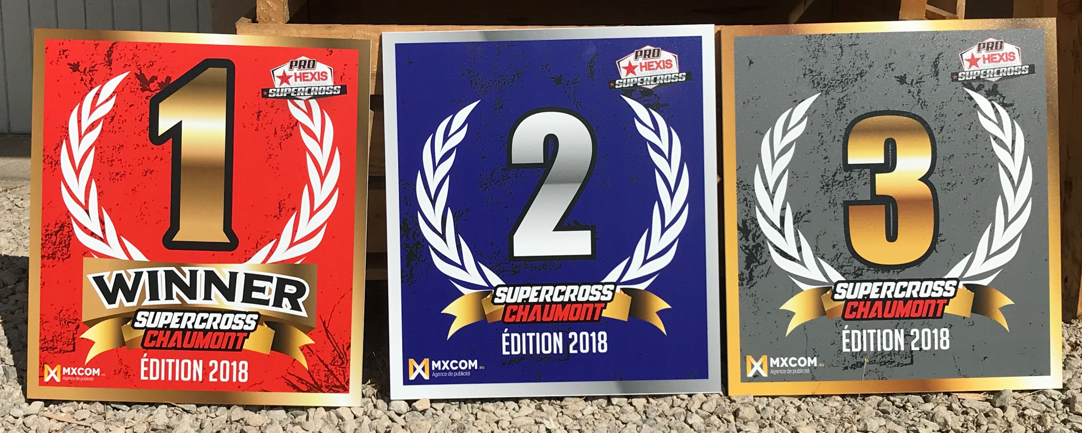 Panneaux en Aquylux (alévolaire), PVC (compressé), Aluminium, Plexiglas, Verre ou Bois, nous sommes capables de vous propose un large éventail de matières, de finitions (oeillets, fixations, …) et de dimensions. Nous sommes aussi capables de créer des trophées originaux.